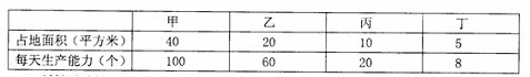 某公司新建一座200平米的厂房,现准备部署生产某产品的设备。该公司现空闲生产该产品的甲、乙、丙、丁四种型号的设备各3台,每种型号设备每天的生产能力由下表给出。在厂房大小限定的情况下,该厂房每天最多能生产该产品( )个。