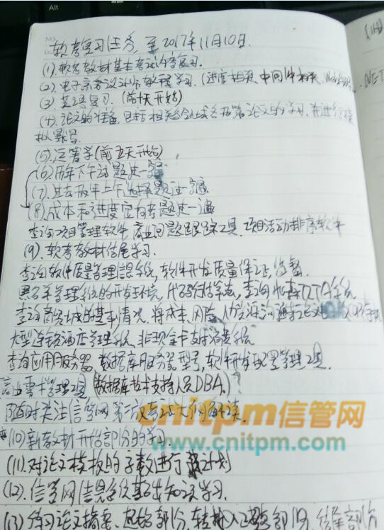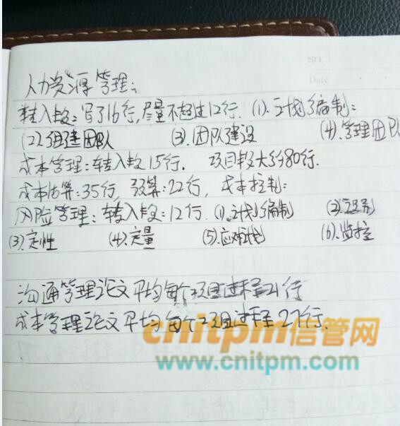 也希望大家自学的过程中也一定要记笔记,从第一遍看书的时候就开始记笔记,记笔记的过程千万不要使用手机或者电脑,一定要手写!我建议至少要在临考前三四个月甚至更早的时候就应该确定论文大致要写的内容,并根据各个领域逐项进行准备。准备论文应该模块化的进行准备,也就是说九大领域任何题目的开头段、固定转入段应该所有题目都是一样的,只是根据各个领域内容不同,把每个领域的过程分出不同的段来。这样,模块化的准备更有利于你备考的时间效率和学习效率。在11月11日下午考场上当我看到“论信息系统的信息安全”时我瞬间感到崩溃了,因为从来没有想到会考这个题目,直到不到半秒钟时间我看到第二个题目成本管理时,我的心脏似乎又从喉咙处重新落了回来,成本管理论文我在整个17年的自学过程和备考过程中至少手写过三四次了,当然这次成本管理论文的考试要求提到了制定成本管理计划。这是事前没有想到的。我事先准备的成本管理论文里没有考虑到制定成本管理计划这个过程,考场上关于制定成本管理计划这个过程我只能根据自己这半年来的学习经验凭借直觉临时写上去的。