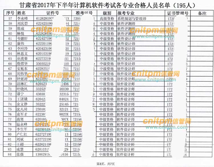根据JRS直播从甘肃人事考试部门获得的相关信息,甘肃2017下半年软考各级别各资格考试合格人员合计195人,其中高级信息系统项目管理师合格人数为44人,高级系统规划与管理师合格人数为2人,中级系统集成项目管理工程师合格人数为32人。以下为甘肃2017下半年软考各级别各资格考试合格人员名单,请以下合格人员按下面链接说明领取证书。