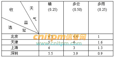 某公司希望举办一个展销会以扩大市场,选择北京、天津、上海、深圳作为候选会址。获利情况除了会址关系外,还与天气有关。天气可分为晴、多云、多雨三种。通过天气预报,估计三种天气情况可能发生的概率为0.25、0.50、0.25,其收益(单位:人民币万元)情况见下表。使用决策树进行决策的结果为( )。