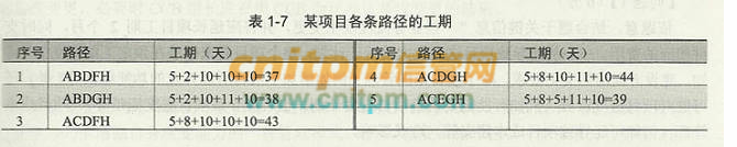 (2)依题意,列出图1-5中的所有路径,并计算各条路径的工期(即时间跨度),如表1-7所示。
