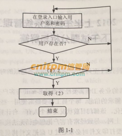 图1-1是实现用户标识与验证的常用方法之一的流程图,图中(1)、(2)分别应填写什么内容?