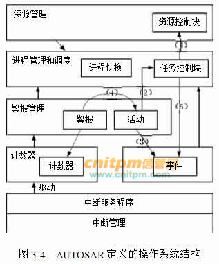 【问题2】(10分) 图3-1中的II-1.1.1项中定义了软件架构和操作系统的要求,图3-4是满足AUTOSAR定义的操作系统各功能模块的层次结构,请说明(1)~(5)箭头所标的具体操作含义。