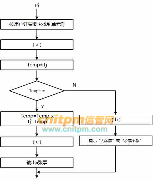 某航空公司机票销售系统有n个售票点,该系统为每个售票点创建一个进程Pi(i=1,2,…,n)管理机票销售。假设Tj(j=1,2,…,m)单元存放某日某航班的机票剩余票数,Temp为Pi进程的临时工作单元,x为某用户的订票张数。初始化时系统应将信号量S赋值为()。Pi进程的工作流程如下图所示,若用P操作和V操作实现进程间的同步与互斥,则图中空(a),空(b)和空(c)处应分别填入()。