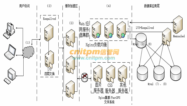 综合王工和李工的提议,项目组完成了新商品交易平台的系统架构设计方案。新系统架构图如图5-1所示。请从选项 (a) - (j) 中为架构图中(1) - (8) 处空白选择相应的内容,补充支持高并发的Web应用系统架构设计图。