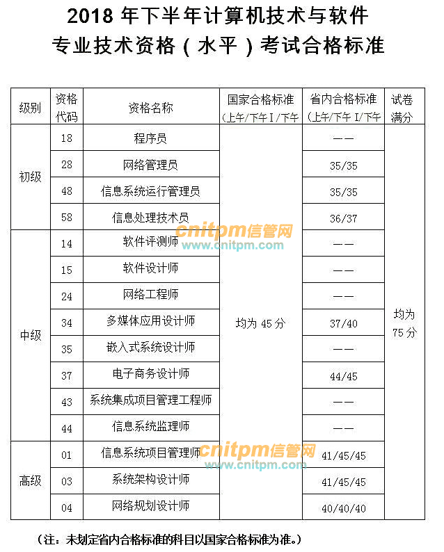 数据来源:陕人社函〔2019〕154号文:陕西省人力资源和社会保障厅关于2018年下半年计算机技术与软件专业技术资格(水平)考试国家和省内合格标准的通知