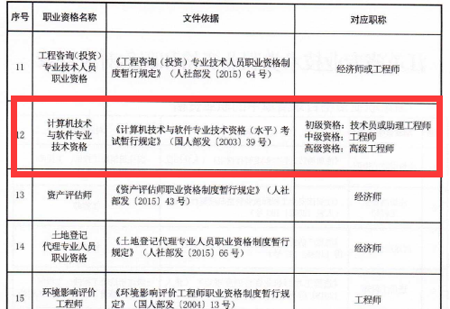 最近,江苏省人社厅公布《江苏省专业技术类职业资格和职称对应目录》(苏人社发〔2019〕93号),打通了职业资格和职称的对应通道。其中计算机技术与软件专业技术资格考试位列其中,通过计算机技术与软件专业技术资格考试初级资格对应技术员或助理工程师,通过中级资格对应工程师,通过高级资格对应高级工程师,所以,对于取得了高级信息系统项目管理师证书的可直接聘任为高级工程师。