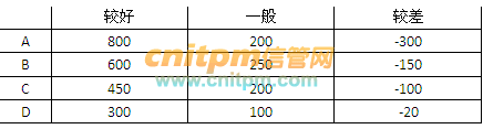 某企业要投产一种新产品,生产方案有四个:A新建全自动生产线;B新建半自动生产线;C购置旧生产设备;D外包加工生产。未来该产品的销售前景估计为较好、一般和较差三种,不同情况下该产品的收益值如下:(单位:百万元)