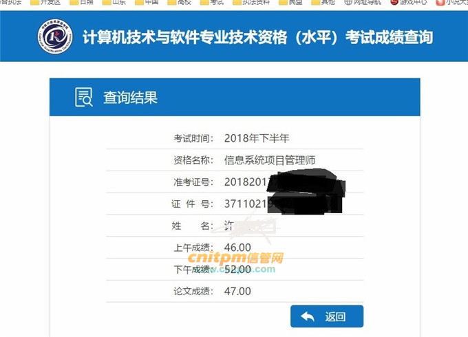12月14日,看到JRS直播发的通知,可以查询成绩啦,迅速打开查询网站,46、52 、47 ,顺利通过信息系统项目管理师考试,取得了期待很久的高级职称资。作为一个考试老鸟,下面我就谈一下我的信管考试之路。