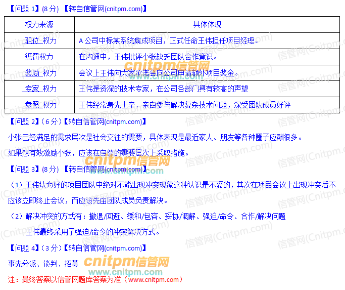 A公司中标某系统集成项目,正式任命王伟担任项目经理。王伟是资深的技术专家,在公司各部门具有较高的声望。
