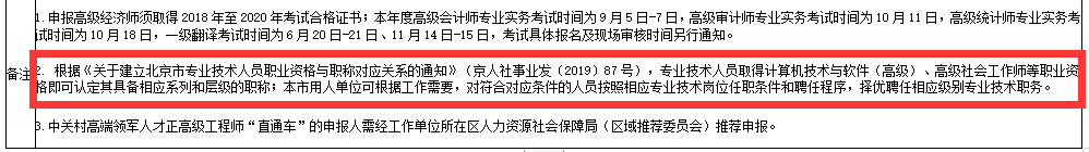 2. 根据《关于建立北京市专业技术人员职业资格与职称对应关系的通知》(京人社事业发〔2019〕87号),专业技术人员取得计算机技术与软件(高级)、高级社会工作师等职业资格即可认定其具备相应系列和层级的职称;本市用人单位可根据工作需要,对符合对应条件的人员按照相应专业技术岗位任职条件和聘任程序,择优聘任相应级别专业技术职务。