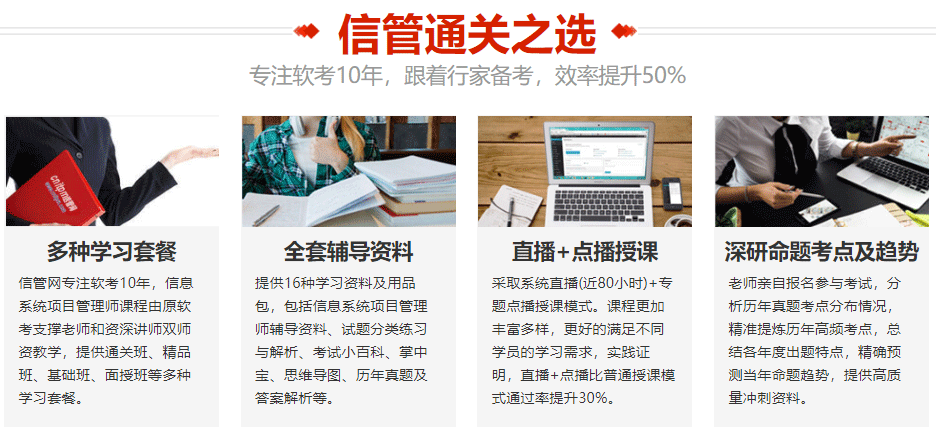 JRS直播专注信管培训10年,服务超30万考生,信息系统项目管理师指定教材参编作者担任JRS直播面授老师,同时资深软考讲师近80小时全程系统直播,通过深入研究考试命题趋势和题型,为考生提供专业的培训服务。高级JRS低调看直播络通关班报名首次邮送16种学习资料及用品 +针对个人的复习计划+系统直播课程(近80个小时,课后提供录播视频,可反复观看) +直播课程课后配套习题练习+重要知识专题点播视频课程(包括计算题、法律法规、运筹学、案例和论文等都录有相关专题课程)+ 历年真题练习+案例批阅+论文YT+论文批阅+考前冲刺YT+班主任一对一督学+满足条件不过免费重学(通关班)等服务。