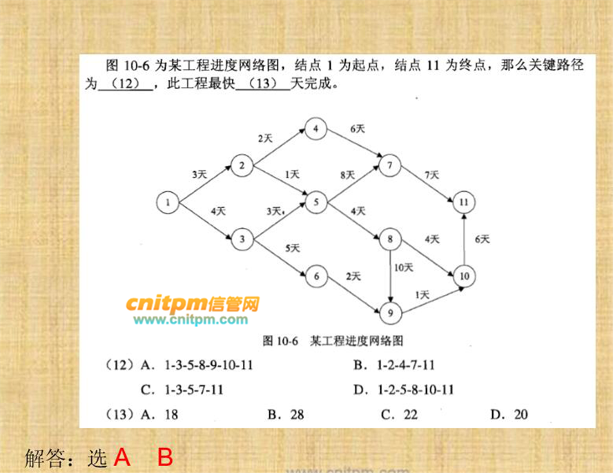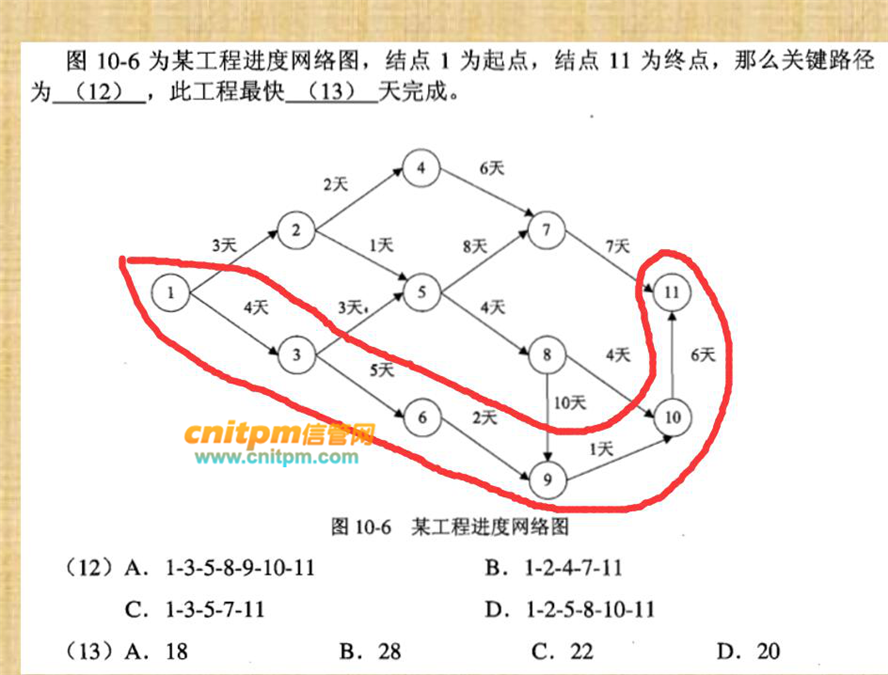 图10-6为某工程进度网络图,结点1为起点,结点11 为终点,那么关键路径为(12),此工程最快(13)天完成。
