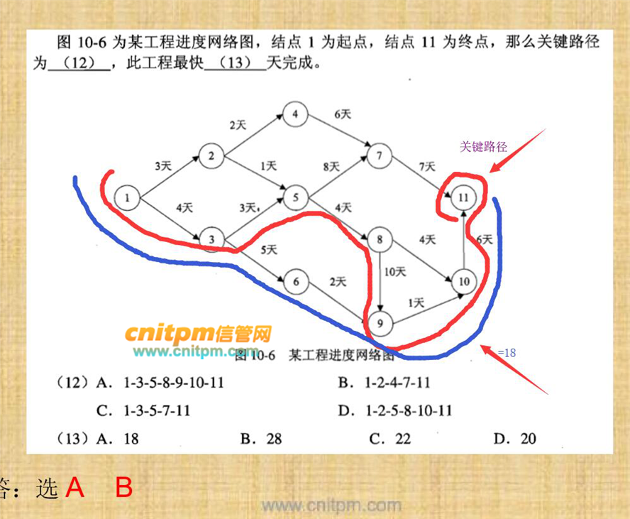 关键路径就是最快工期,总工期28天,18天只是完成总工期的一部分工序