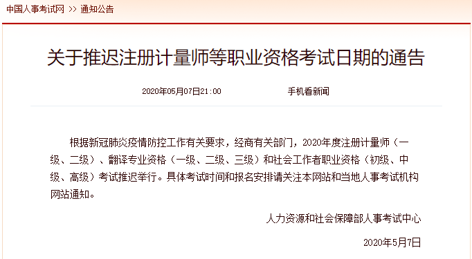 根据新冠肺炎疫情防控工作有关要求,经商有关部门,2020年度注册计量师(一级、二级)、翻译专业资格(一级、二级、三级)和社会工作者职业资格(初级、中级、高级)考试推迟举行。具体考试时间和报名安排请关注本网站和当地人事考试机构网站通知。