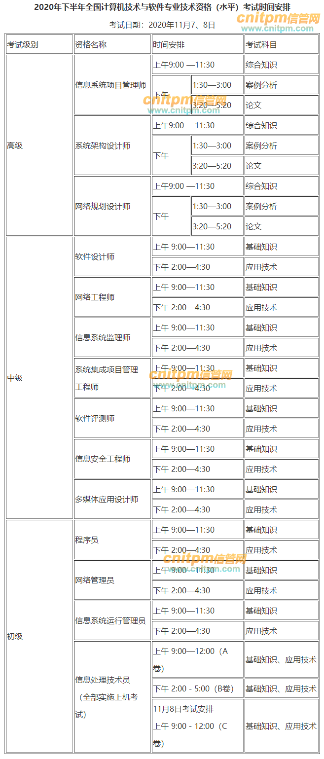 2020年信息系统项目管理师考试时间预计下半年为2020年11月7日,具体安排参考:
