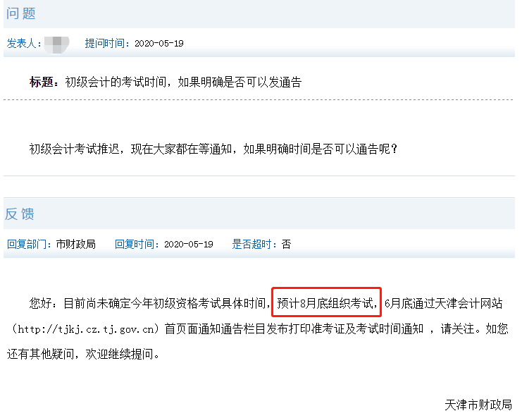 (注:19日天津市财政局又在反馈中回复:目前尚未确定今年初级资格考试具体时间,预计8月底组织考试,请6月底关注通知)