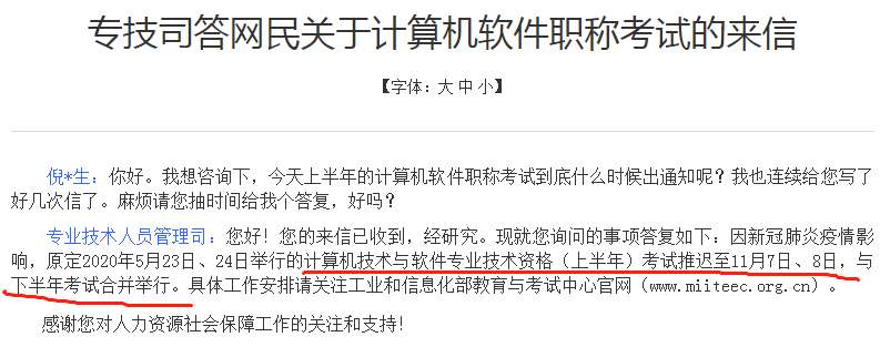 人社部专业技术人员管理司于6月9日在部长信箱中特别回应有关2020年上半年软考考试时间相关事宜:指出计算机技术与软件专业技术资格(上半年)考试推迟至11月7日、8日,与下半年考试合并举行。