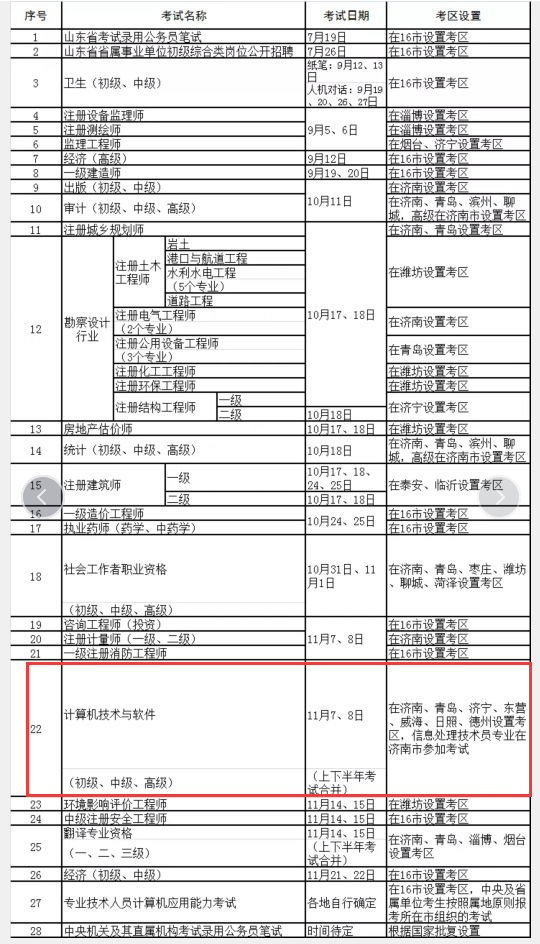山东省公布了2020年人事考试计划!文件确定了今年软考考试11月7、8日如期举行,还公布了考区!