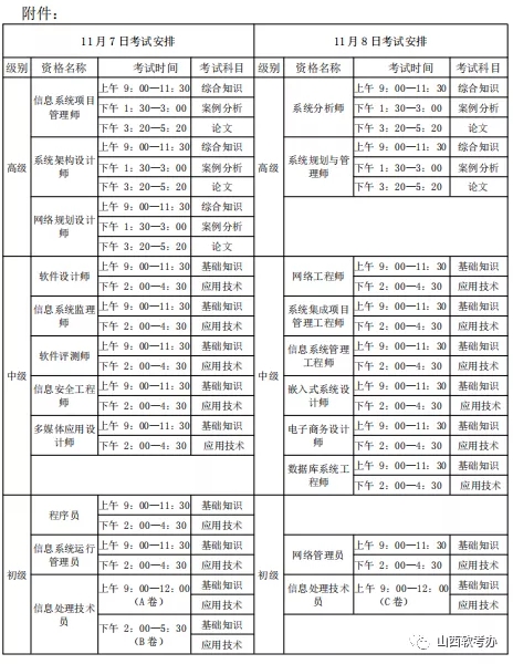 2020年计算机技术与软件专业技术资格(水平)考试于2020年11月7日、11月8日举行,开考级别、专业资格名称、考试时间、考试科目和考试形式详见考试安排(附件),考试期间的疫情防控措施请关注“山西软考办”微信公众号的通知。本次考试指定教材请登录中国计算机技术职业资格网(www.ruankao.org.cn)进行查询。