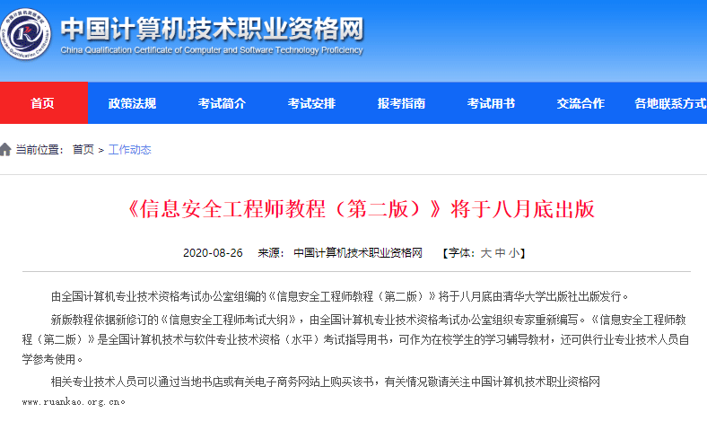 由全国计算机专业技术资格考试办公室组编的《信息安全工程师教程(第二版)》将于八月底由清华大学出版社出版发行。