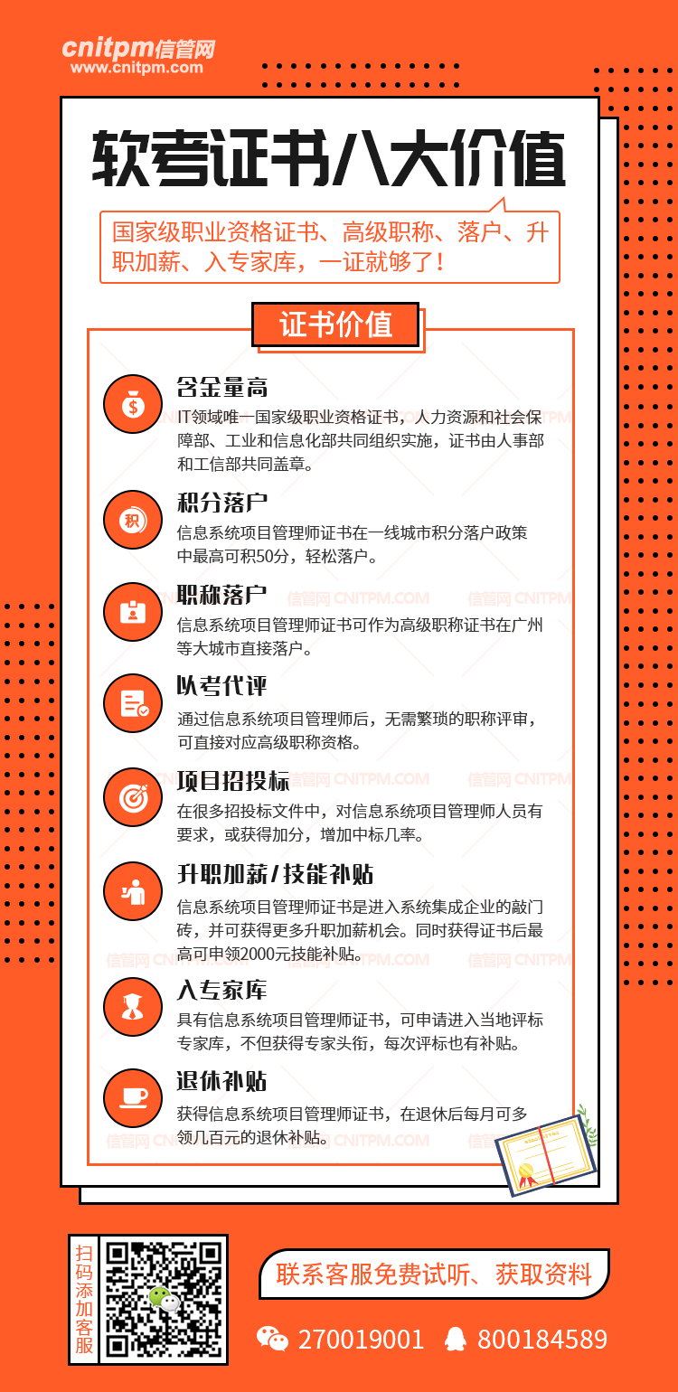 软考这么火爆的原因其实还有另外一个,就是它的含金量高,评定职称,积分落户,升职加薪,有了它,你都可以办到。