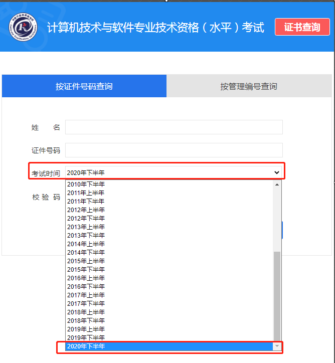 4、选择按“证件号码查询”或“按管理编号查询”,填写相关信息,选择考试时间,输入校验码,然后点击查询即可。