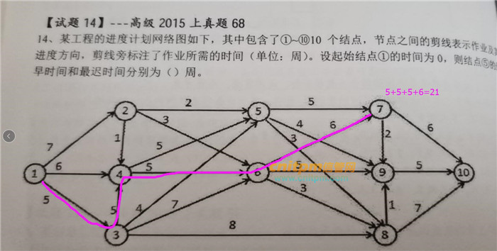 7 的最早开始时间是21,节点5-7之间时间是5,那21-5=16,所以5的最晚时间是16