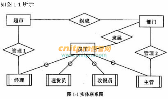 1.1a经理号,b超市编号,c主管号,d隶属部门号<br><br>1.3 i部门号,j主管号,员工号l,m隶属部门号<br>1.4不对,任职时间和任职年限属于员工的属性描述,可以直接在员工表增加这两个字段。