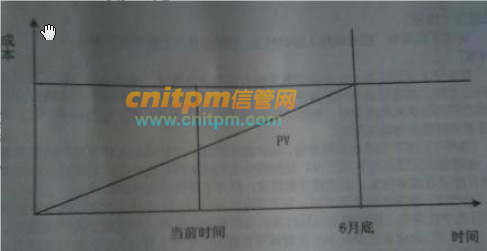 假设项目按照当前的绩效进行直至项目结束,请在下图中画出从项目开始直到结束时的EV和AC的曲线,并在图中用相应的线段表明项目完成时间与计划时间的差(用“t”标注)、计划成本与实际成本的差(用“c”标注)。
