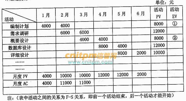 某项目6个月的预算如下表所示。表中按照月份和活动给出了相应的PV值,当项目进行到3月底时,项目经理组织相关人员对项目进行了绩效考评,考评结果是完成计划进度的90%。