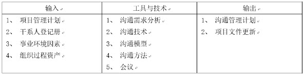 概念:根据干系人的信息需要和要求及组织的可用资产情况,制定合适的项目沟通方式和计划的过程