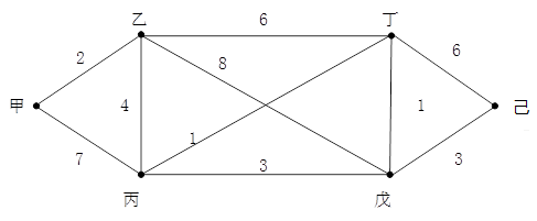 已知有6个村子,相互之间道路的距离如下图所示。现拟合建一所小学,已知甲村有小学生50人,乙村40人,丙村60人,丁村20人,戊村70人,己村90人。从甲村到己村的最短路程是( 1 );小学应该建在( 2 )村,使全体学生上学所走的总路段最短 (1)A、10B、11C、12D、14(2)A、甲B、丙C、丁D、己