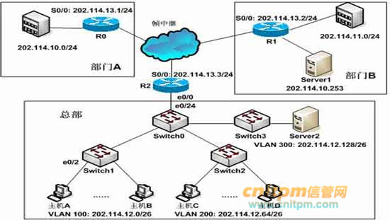 某公司有1个总部和2个分部,各个部门都有自己的局域网。该公司申请了4个C类IP地址块202.114.10.0/24~202.114.13.0/24。公司各部门通过帧中继网络进行互联,网络拓扑结构如图1-1所示。
