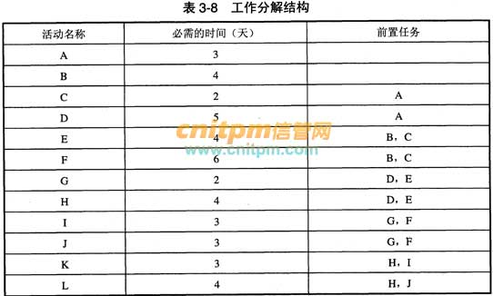 在与项目团队成员探讨后,假设已经确认了12项基本活动。所有这些活动的名称、完成每项活动所需的时间,以及与其他活动之间的约束关系如表3-8所示。