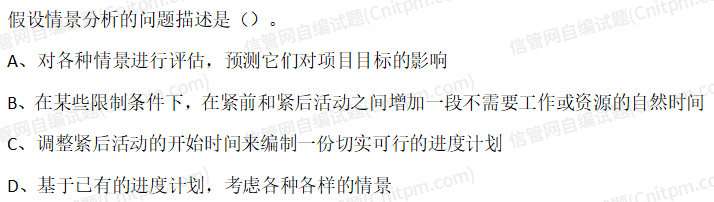 假设情景分析的问题描述是()。A.对各种情景进行评估,预测它们对项目目标的影响B.在某些限制条件下, - JRS直播