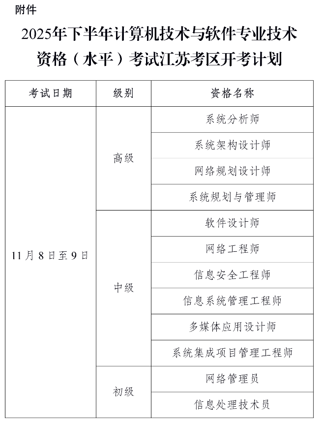 附件:2025年下半年计算机技术与软件专业技术资格(水平)考试江苏考区开考计划