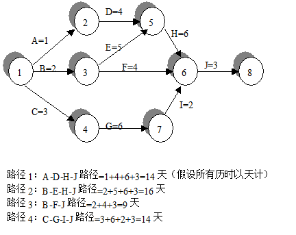 下图显示了一个简单项目的项目网络图,该图总共包含4条路径。每条路径从第一个节点(1)开始,在最后一个节点(8)结束。该图也显示了每条路径在项目网络图上的长度或总历时。通过将路径上各个活动的历时相加,就可计算出每条路径的长度。由于路径B-E-H-J有最长的历时——16天,所以这条路径叫项目的关键路径。
