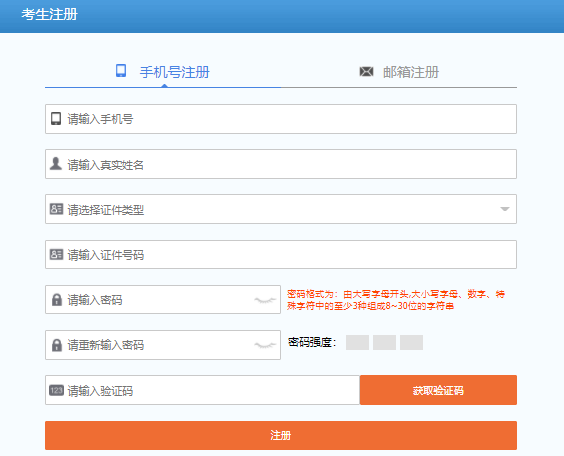 三、选择使用手机号或是邮箱进行注册,输入手机号/邮箱、真实姓名、证件类型、证件号码、密码、验证码进行注册。(备注:密码格式为由大写字母开头,大小写字母、数字、特殊字符中的至少3种组成8~30位的字符串)。