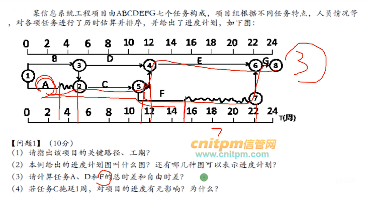 我应该多想一步: F的有两条路径,bcfg=7,acfg=9.总时差取最小值,所以是7