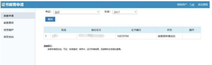 考生状态为“邮寄预申请成功”,说明考生邮寄申请已成功。后期,进行证书状态查询的话,点击“邮寄查询”按钮。点击后的操作界面如下: