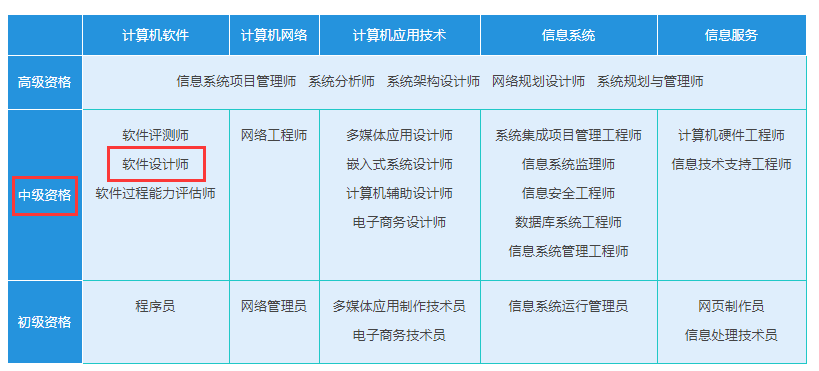 答:软件设计师证书属于中级。软件设计师属于计算机技术与软件专业技术资格(水平)考试(软考)中级考试项目,考试合格者将颁发由中华人民共和国人力资源和社会保障部、工业和信息化部用印的计算机技术与软件专业技术资格(水平)证书。该证书在全国范围内有效。