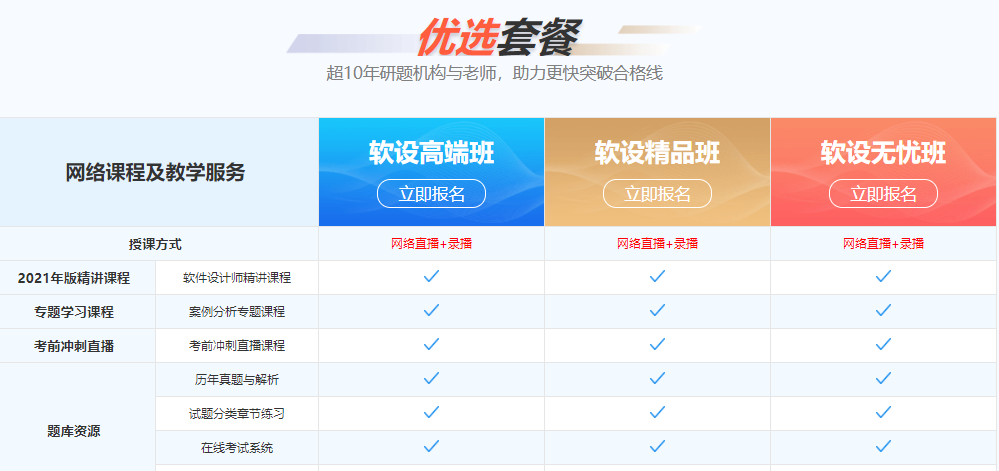 目前,JRS直播针对不同学员的培训需求,特开设有高端班、精品班、无忧班多种学习套餐供考生选择,提供更为全面的软件设计师培训服务。
