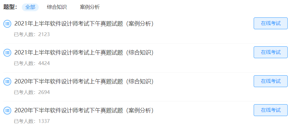 软件设计师考试中心为考生提供每日一练、章节练习、历年真题、模拟试题、课后习题、易错题、考前点题、模考大赛等服务。