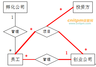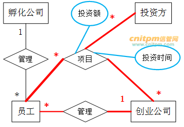 (4)投资方和创业公司之间依靠孵化公司牵线建立创业项目合作关系,具体实施由孵化公司的一位员工负责协调投资方和创业公司的一个创业项目。一个创业项目只属于一个创业公司,但可以接受若干投资方的投资。创业项目信息包括项目编号、创业公司代码、投资方编号和孵化公司员工工号。