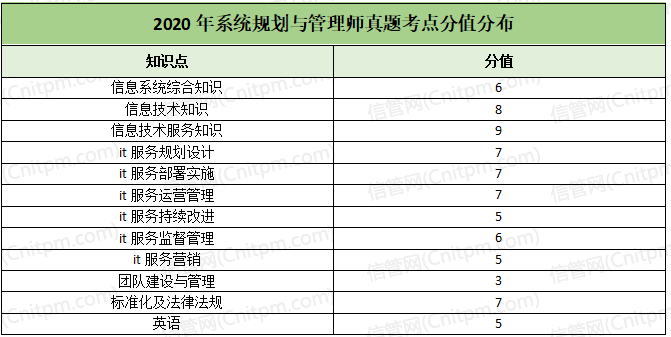 2020年系统规划与管理师真题考点分值分布(综合知识),其中信息系统综合知识6分、信息技术知识8分、信息技术服务知识9分、it服务规划设计7分、it服务部署实施7分、it服务运营管理7分、it服务持续改进5分等,具体请查看下表: