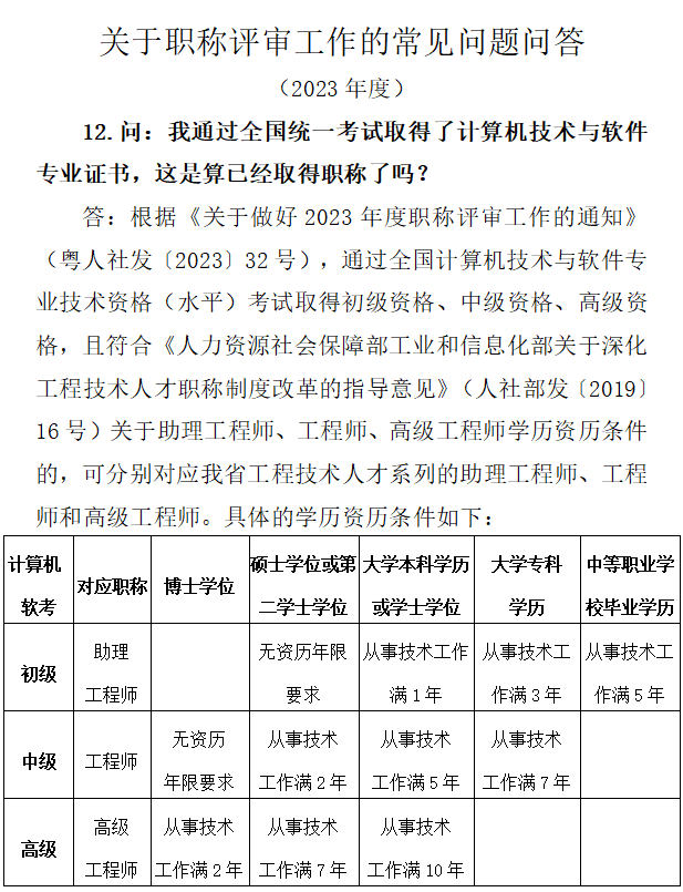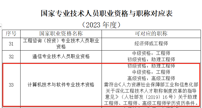 我省已建立国家专业技术人员职业资格与职称对应关系(详见附件2),2023年度继续在职称评审工作中实行。专业技术人才取得相应国家专业技术人员职业资格的,可按规定视同其具备我省对应系列和层级的职称,并可作为申报高一级职称的条件。申报高一层级职称评审时,资历自职业资格评价通过日期起算。