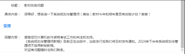 系统规划与管理师于2017年首次开考,目前,官方教材使用的还是2017年出版的《系统规划与管理师教程》,虽然2024年下半年仍然使用这版教材,但2025年就不一定了,因为网传官方回复:《系统规划与管理师教程》目前正在出版中,2024年下半年不启用新版教程。