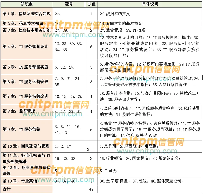 综合知识:上午综合知识是有一定难度的,比2023年下半年考试难度略低,大部分题目都是官方教材上的原话,算是紧扣教材出题。从收集到的41道题目来看,第四章到第九章出题比较较高,特别是第四章IT服务规划设计,第六章IT服务运营管理,第九章IT服务营销在这次考试中占比较高,第一章、第二章、第三章,以及第十二章在此次考试中出题比较较低,其余章节变化不大。