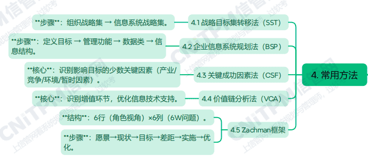 系统规划与管理师第2版教程第第四章信息系统规划第四节常见方法考点涉及:战略目标集转移法、企业信息系统规划法、关键成功因素法、价值链分析法、zachman框架等,具体思维导图整理如下: